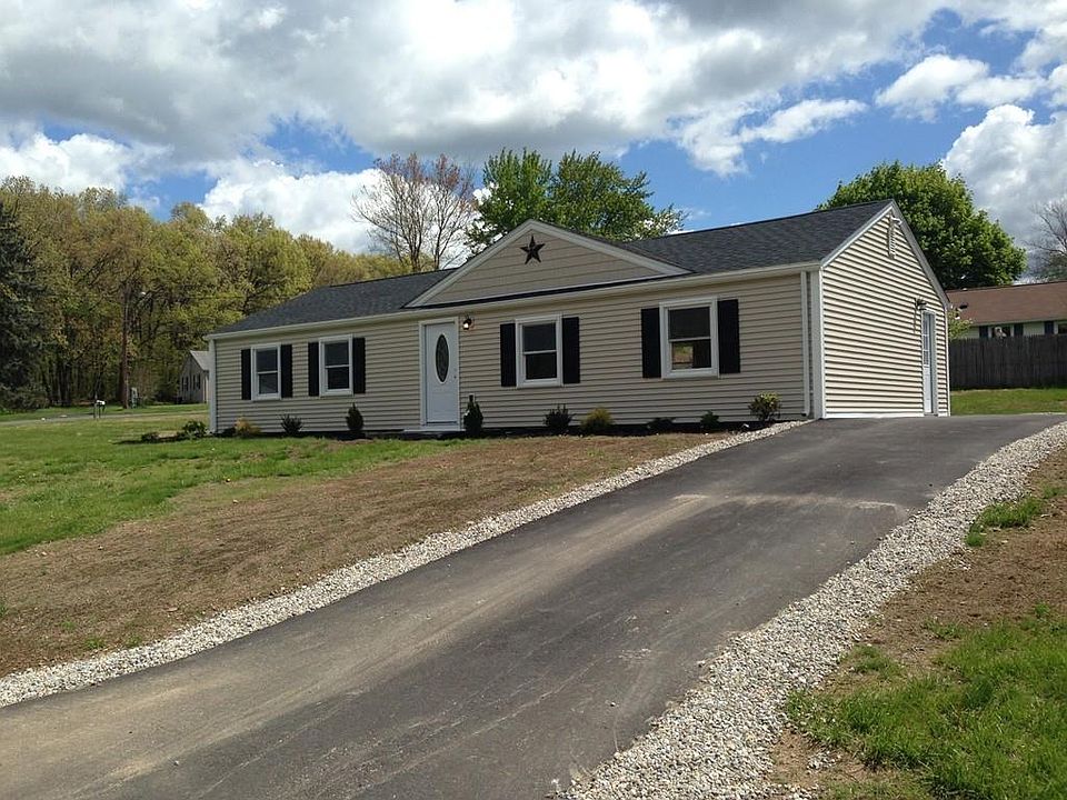Come see this newly remodeled cute and cozy ranch style home! Move in ready on a quiet neighborhood street. Spacious open concept between living room, kitchen and dining room. Down the hall there are 3 bedrooms and one brand new bathroom with washer and dryer hookup. New kitchen with brand new stainless steel appliances. Roof and siding have been replaced. Replacement windows, high efficiency gas furnace, and all new electrical panel and service. New Driveway and grass has been seeded. Nice shed in the backyard for storage. Also, approximately 2 miles to Masspike, route 91 and 291.