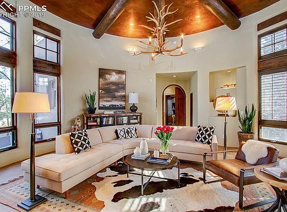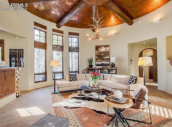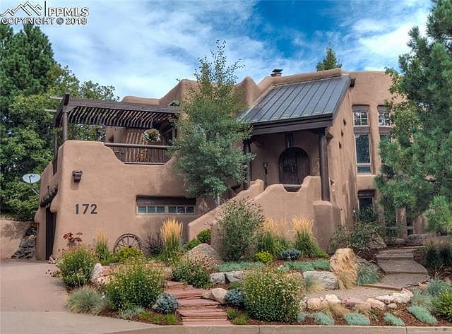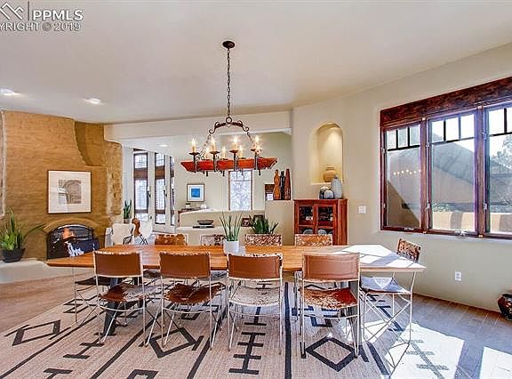 Rare Pueblo styled home w/authentic Adobe construction. Built by a crew from Sante Fe. 2-ft thick walls for year round temperature comfort. 3 true adobe fireplaces w/gas logs. Floating Brick floors or hand scraped wood floors thru-out...NO carpet! Amazing round Great Room w/brick floors, soaring 18' copper ceiling w/Vegas (beams) & two-sided Adobe fireplace that also opens to kitchen & dining room. Hand finished lathe & plaster walls. Antique hand-hewn Hacienda doors. Antique wrought-iron light fixtures throughout.