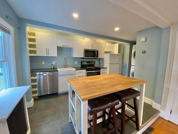 Totally private and renovated 1 bedroom feels like your own house, just steps to Framingham State College on a lovely tree lined street close to highways and shopping. This unit has its own private driveway and private rear deck, and access to huge shared yard. Open floor plan and beautiful hardwood flooring. Kitchen has in unit washer/dryer, stainless steel appliances and a nice island. Spacious bedroom with free standing closet. New gas heating system. 2 car parking. First, security and 1/2 mo fee. References. No pets please. Maximum 2 residents.