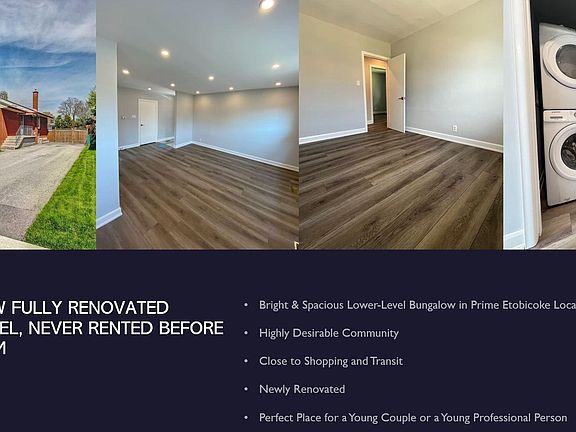 BRAND NEW, 1 BEDROOM 1 BATH 1 PARKING FULLY RENOVATED. Book Your Viewing Here Recently Newly Fully Renovated, Never Rented Before. Bright & Spacious 1 Bedroom, 1 Bath Lower Level Bungalow In Prime Etobicoke Location. Highly Desirable Community. Close To Shopping And Transit. Perfect Place for a Young Couple or a Professional Person. BRAND NEW, 1 BEDROOM 1 BATH 1 PARKING FULLY RENOVATED. Book Your Viewing Here Recently Newly Fully Renovated, Never Rented Before. Bright & Spacious 1 Bedroom, 1 Bath Lower Level Bungalow In Prime Etobicoke Location. Highly Desirable Community. Close To Shopping And Transit. Perfect Place for a Young Couple or a Professional Person.