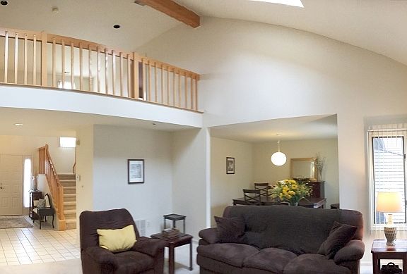 Desirable Apple Ridge end unit. Privete court yard welcomes you into to the two story foyer. The LR/stone fire place, cathedral ceiling and skylights. DR with slider to deck. First floor MBR suite... Den and PR. MK w/ separate eat in area. Laundry area and easy access to the 2 car garage. Second floor has open loft area over looking the LR. Two spacious bed rooms and full bath. Basement has high ceiling. Unfinished with great potential. Don't miss the chance to live in the gated Apple Ridge community with nice amenities.