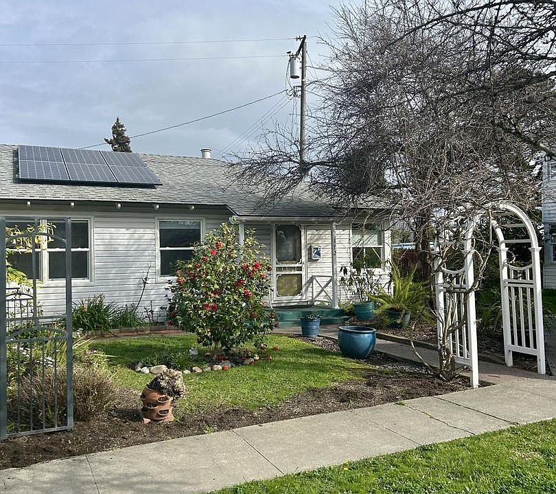 This charming 865 square foot unit is located in historic Atchison Village. Solar. Eucalyptus hardwood floors in living room, hall, 3 bedrooms. Insulated attic and floor. Double pane windows. Kitchen luxury vinyl plank flooring. Plumbing replaced with copper in 2017. Quartz countertops, back splash. Washer, dryer, stove, refrigerator. Bathroom totally replaced in 2017. Kohler rain head shower & comfort height low flow toilet. Ceramic tile floor. Subway tile all around for the vintage look. Established garden, front yard and side yard, 9 rose bushes and plenty of room to add plants. Front yard flowering Hawthorne & Camellia. Arbor w/wisteria. Backyard paved in 2021. Shed w/electricity, shelves, 2 loft spaces. Deck and fountain, great for bird watching. Two outside electrical outlets. No garage, assigned parking space in paved lot directly behind the backyard gate making it convenient to unload. Fast charge 240V EV charger in backyard. Extension cord (one made for EV charging) reaches the parking space. There is no deed, purchase is for a share in the Atchison Village Mutual Homes Corporation which entitles you to live in the unit in perpetuity. HOA fees include garbage, water, sewage, reserves, insurance on bldg., plumbing and electrical repair or replacement.