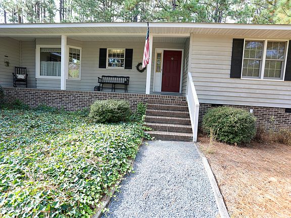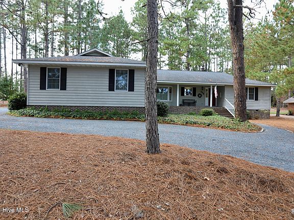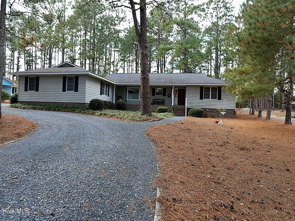 Great opportunity to own a single level ranch home in gated community of Seven Lakes South! Located across the street from the picturesque Seven Lakes golf course and nestled between the pine trees on a level, low maintenance lot. Circular driveway leads to covered front porch entrance and side entrance garage. This popular split bedroom floorplan home offers spacious rooms and wide hall and doorways for easy access. The primary bedroom with ensuite bath includes great storage with walk-in closet plus 2 separate closets! Large guest bedrooms with ample closets as well. Spacious Living Room and formal dining room combination highlighted by brick wood burning fireplace and glass sliders leading to screen porch and patio overlooking the large backyard. Kitchen offers ample cabinet space and eat-in kitchen with bay window. Great utility/laundry room with pantry & storage closet plus utility sink and overhead cabinets. The side entrance garage is large and offers lots of storage, as well as exterior door to side parking and backyard. The pinestraw backyard is flat, level and low maintenance. Enjoy the relaxing setting from the comfort of the spacious screened-in porch of concrete patio for grilling and entertaining. The front of the home sets back from the road with large circle gravel drive for convenience access. Home has new hvac system added in 2020. Seller is providing a buyer home warranty at closing.