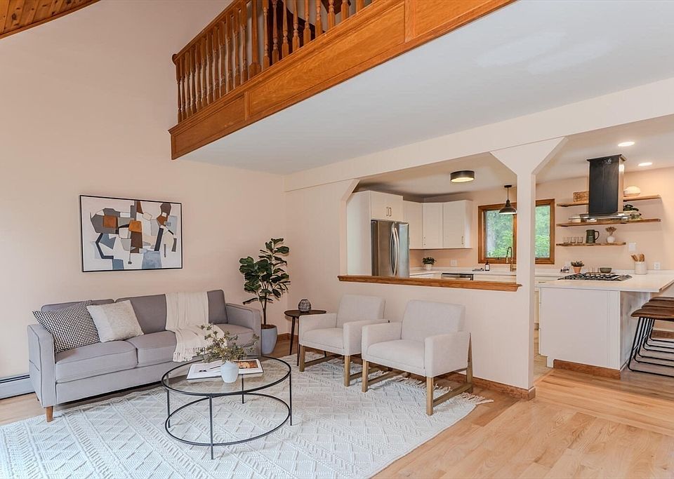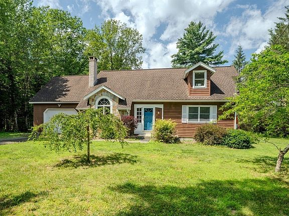 Step into your private oasis with a gorgeous renovated interior! Enter to discover gorgeous vaulted wood ceilings, mini-split to heat and cool the open layout and cozy pellet stove for winter nights. The stunning kitchen features brand new SS appliances, high-end LVT flooring, and quartz countertops w/ gold veining to tie in beautifully w/ the wood tones of the home. A glass door off the dining room leads to a deck overlooking the gorgeous yard and nearly 7-acre lot. Single-level living is possible, with a large 1st floor bedroom, stackable laundry, & a renovated full bath w/ walk-in shower. There are beautiful, warm, new and refinished HW floors throughout the main level. Upstairs you'll find 2 additional large bedrooms, an open loft overlooking the living room w/brand new carpet, & a remodeled full bath w/ double vanity and a tiled surround. Updated modern lighting throughout the home. Bonuses include a 1-car oversized garage, 2 sheds, generator hookup, & fiber optic internet.