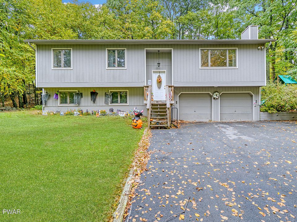 BEAUTIFUL 3 BEDROOM BI-LEVEL WITH CATHEDRAL CEILINGS, HARDWOOD FLOORS, WOOD BURNING FIREPLACE, OPEN FLOOR PLAN, & 2 CAR GARAGE! Situated on 1.04 acres & backing up to community owned property, find this private, updated home ready for you to move in! Inside, snuggle up by your brick-faced, charming fireplace with family & friends while hosting holiday meals! Cook the fabulous, festive feast in your spacious eat-in kitchen with SS appliances, breakfast bar, & access to your big back-deck for barbecues & star gazing! Down the hall your pleasing master bedroom with attached, tiled, modern, master bath. 2 more large bedrooms & a full bathroom complete the main level. Downstairs, a huge family room which can also serve as a guest suite, office, or gym! Lower level laundry & storage!