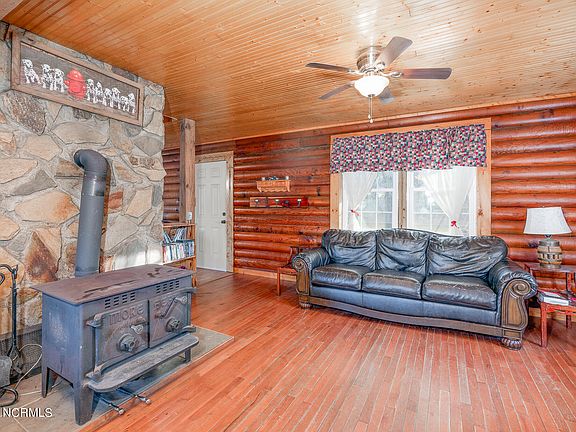 As you approach, the log cabin's timeless exterior exudes warmth and character. Inside, a cozy retreat awaits, bathed in natural light. The main level welcomes you with an open-concept living area featuring exposed beams and a traditional wood-burning stove, perfect for cozy evenings. Large windows offer picturesque views of the surrounding landscape, seamlessly blending indoor and outdoor living.