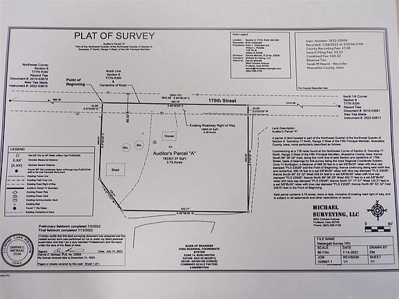3 bedroom 1 bath home sitting on 3.75 Surveyed Acres. 40x60 Clear span steel building with concrete floor. This property also has 2-10,000 bushel grain bins, 28x25 steel utility building with horse stalls, and several other outbuildings. This property has numerous possibilities. The house could be a great rehab project or a new house could be built in its place. This property is being sold As-Is, seller will do no repairs or alterations and any inspections would be for buyers information only. If any replacement or repairs to the septic system are required they will be at the expense of the buyers and the necessary paperwork filled out with Muscatine County. *Property taxes provided are before the property split, They will be recalculated by Muscatine County.