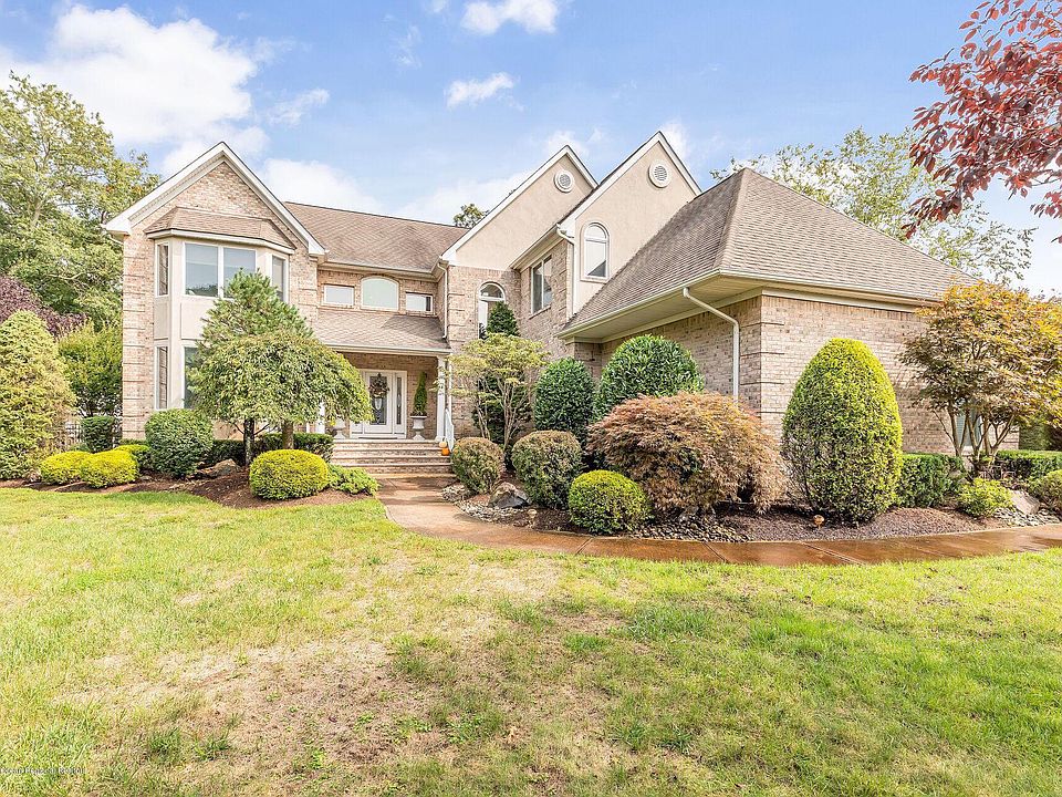 Stunning 5 BR Custom home, nestled on a secluded premium corner lot, located on nearly 1.5 acres in desirable Wall Twp. 1st Fl office, beyond French doors from the cozy den w/gas FP. HW Floors throughout this sprawling 4500 SF home. Kitchen offers top notch appliances & granite counters. Family can gather around the large center island or the fantastic eat in kitchen space overlooking the backyard w/pool + pool house. Great for entertaining, the kitchen area spills into the sunken 2 story family room. 1st floor BR ideal for guests. Master BR offers vaulted ceilings, walk in closets & both his & her vanities, soaker tub + shower stall. Each bedroom has its own access to full bathroom. Full Finished Basement is an additional 2k SF of must see space.