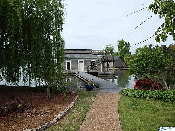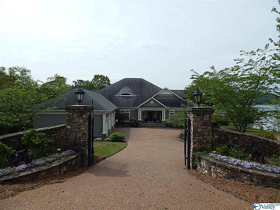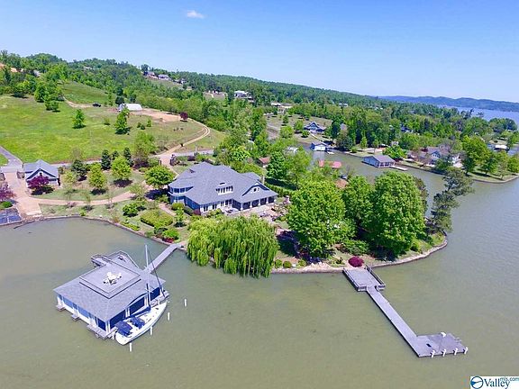 Luxury at its finest behind wrought iron gates! This custom traditional old world home, 6Bd/8Ba, is on the main channel of Guntersville Lake, on prestigious Buck Island Drive w/ 2 slip boat house w/ roof top deck & separate pier w/ seawall. This home was extensively updated in 2012 w/ new cabinetry, marble countertops, stainless appliances, Isokern wood burning fireplace w/ iron cladding, curved iron staircase, custom antique oak beam flooring, new master bath w/ marble & slate shower & soaking tub, large master closet w/ built-ins. Other features: new HVAC units 2019, sauna, butler's pantry, generator, garden shed, screened porch, hot tub, sprinkler system, detached garage & so much more!