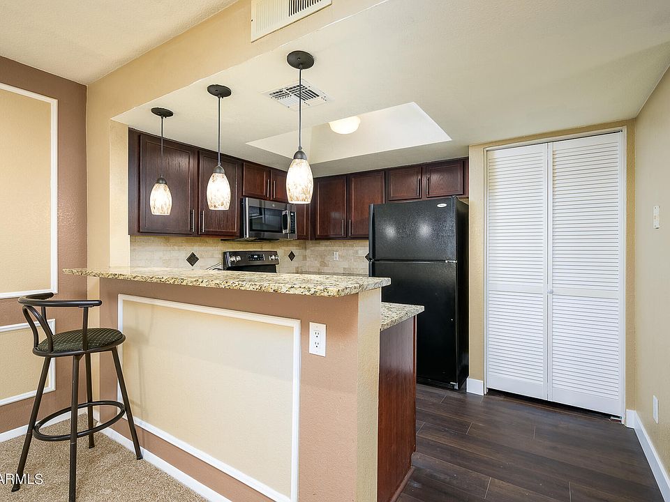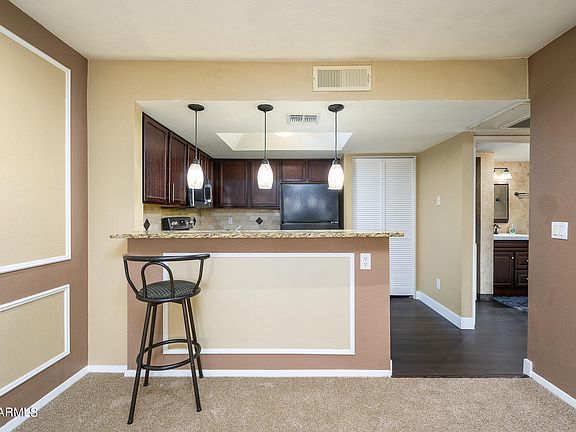 Beautifully renovated condo with many updates. Spacious bedroom with separate sliding glass door with access to covered porch. Functional kitchen with granite countertops and breakfast bar. Newly updated items include: plumbing under tub and both sinks, washer/dryer, stove, microwave, dishwasher, carpet/ waterproof vinyl flooring in kitchen and bathroom, front door. Recently updated items include: sliding doors and windows replaced 11/18, water heater 2 years old, HVAC replaced 4/19. Spacious storage closet off porch. Community amenities include two heated pools, one just steps from condo, two spas, workout facility and a clubhouse media room. Your covered carport space is just at bottom of stairs. Perfect central location with convenient access to freeways and for anyone who loves the outdoors, close proximity to Phoenix Mountain Preserve with miles of hiking trails in addition to nearby restaurants and Lookout Mountain golf course. Great for primary residence, seasonal property or investment. Minimum rental period of 6 months.