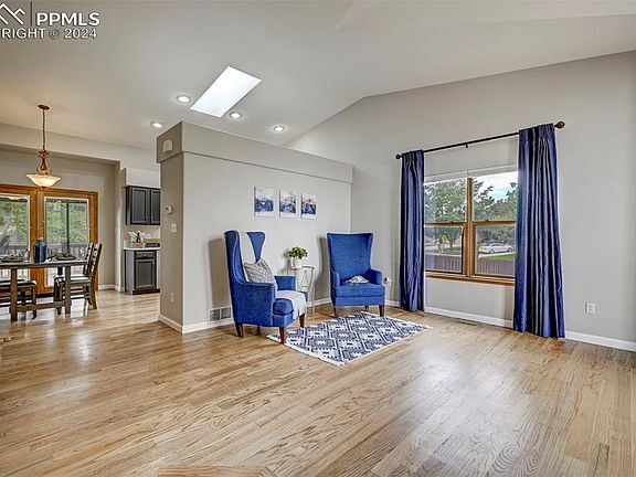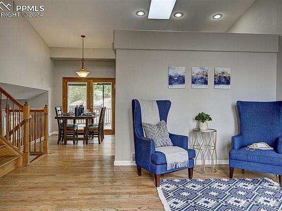 Nestled in a serene cul-de-sac, this beautifully maintained home offers abundant indoor and outdoor living space. The main level boasts stunning hardwood floors, soaring vaulted ceilings, and a versatile front room perfect for formal dining or comfortable living. The updated kitchen features a large skylight, quartz countertops, stainless steel appliances, and a convenient eat-in area that opens to a spacious covered Trex deck with a ceiling fan, electrical outlets, and a relaxing swing hammock, enclosed by privacy siding. The expansive backyard includes a greenhouse, garden, and oversized side gating for easy access. Upstairs, the primary bedroom consists of a luxurious 5-piece en-suite with French doors and a walk-in closet, while two additional bedrooms and a full bathroom complete the upper level. The lower level is designed for entertaining, with a cozy gas fireplace, a powder room/laundry room, a door leading to the oversized 2-car garage, and a walk-out to the large patio in the spacious backyard. The basement offers additional living space with the potential for an extra bedroom, office, or recreation room, along with another bedroom and attached bathroom. Seize the opportunity to transform this inviting home into your oasis of comfort and style. It is conveniently located near schools, shops, Fort Carson, Quail Lake, Dog Park, and Pikes Peak State College.
