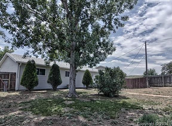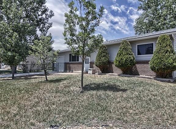 Move-in ready! Ranch plan with 3 bedrooms and oversized attached garage. Brand new interior paint, carpet, vinyl and window coverings. Windows, drive way, roof and water heater updated in last few years. Large lot is fully fenced and has mature plantings. Rear storage shed. Quiet neighborhood. Long term residents. Well cared for. Steel siding. Close to military and I25 access.
