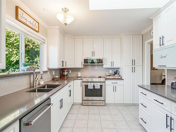 Welcome to this beautifully updated home with a legal suite and over 2,700 sq. ft. of living space. Recent upgrades include new windows, roof, KitchenAid appliances, and hot water tanks in both the main home and suite. The kitchen features quartz counters, heated tile floors, and plenty of storage, while the main bath offers heated floors, double sinks, and a walk-in shower. Enjoy the cozy gas fireplace, efficient furnace, and garage for extra storage or parking. The layout offers flexibility with two bedrooms on the main level and three more downstairs, including one with a Murphy bed and new mattress. The 1-bedroom legal suite has its own laundry and dishwasher and can be offered furnished. Outside, relax in the private fenced yard with mountain views, gas BBQ hookup, gazebo, irrigation, sheds, fruit trees, and fire pit. Ideally located near schools, shopping, and outdoor recreation. All data approx.