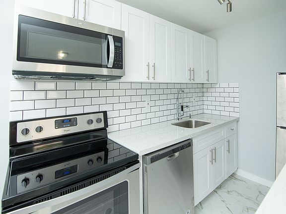 Unique backsplashPrivate backyardQuartz countertopsSubway tilesModern bathroomPorcelain floorsStainless steel appliances