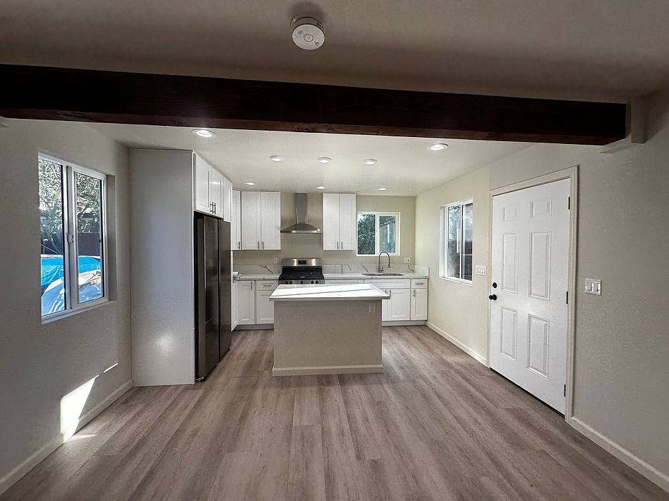 - Kitchen: Brand-new cabinets, quartz countertops, and a complete suite of new appliances, including a refrigerator, stove, microwave, and garbage disposal.