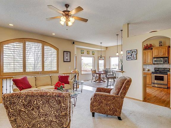 Move-in and enjoy this beautiful open floor plan with exceptional outdoor living space and gorgeous water views! With fantastic curb appeal, this home is inviting as you step into the exterior and interior foyers. This home features an open floor plan with spacious living areas and fantastic windows providing abundant natural light and stunning water views. The main floor includes the perfect living room with a gas fireplace, built-in media storage and open wrought-iron railing to the mid-level walkout area, with fabulous custom wood shutters on the mid-level walkout windows. The living room is open to the dining area with awesome windows framing the water views. The dining area has plenty of space for a large table, and the kitchen includes a large eating bar, with wood floors in the kitchen and dining area. The kitchen features impressive cabinet and counter space, large walk-in pantry, full tile backsplash, and stainless steel appliances (range/oven, microwave, and dishwasher.) The separate laundry room is adjacent to the kitchen and has an entry bench for coats and shoes, and great laundry shelves and cubby areas for storage. The owner's suite includes a spacious master bedroom with vaulted ceilings and a high decor and lighted niche shelf, and a master bathroom with a whirlpool corner tub, oversized shower, two separate vanities and sink areas, and a large walk-in closet. The main floor also includes two additional bedrooms with large closets and an adjacent bathroom with tub/shower. The finished viewout basement features a spacious family/recreation room with the perfect space for media viewing and pool table/game table, a striking stacked-stone corner gas fireplace, lots of can lighting, wiring for surround sound, bookcase for hidden under-stairs storage, and a stylish wet bar with bar seating, great storage including extra drawers and awesome custom features - Carrara marble flooring, Carrara herringbone backslash and gorgeous granite countertops. The basement also includes an additional large bedroom and bathroom with tub/shower and tile floor, and two storage rooms. The exterior features the perfect outdoor area to relax and enjoy the peaceful water views! There are two large tiered decks with a wraparound to the back of the garage area, wrought-iron fence, sprinkler system, and an irrigation well. Special taxes paid out in 2017!! The basement finish was completed in 2016 and additional updates include: newer roof, hot water heater, exterior paint, garage door opener and keypad, kitchen faucet, and dishwasher. This home has the perfect and unique combination of indoor and outdoor living space to enjoy with your family and friends!