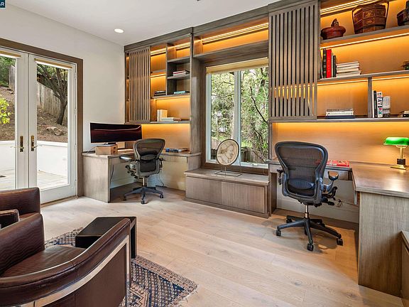 This Reliez Valley home is a private sanctuary. The main level offers formal spaces to the left and casual spaces to the right, linked by French oak hardwoods. The 384-sq-ft living room has a limestone fireplace. The dining room alongside welcomes 10-12 guests under elevated ceilings. The spacious family room also has a soaring ceiling. Nearby, a breakfast nook provides garden and pool views. Between sits the kitchen, with elite appliances, countertops, an island and bar seating. For entertainment, the home offers an 85” TV and sound system, and a spectacular 400-sq-ft cinema. A large office on the main level makes work from home easy. The 5 bedrooms are on the lower level, ensuring privacy. The principal suite is a serene haven with a custom fireplace, garden views, deck access, walk-in closet, and a spa-like bath. A second principal suite has its own en-suite bath, closet with built-in desk, and deck access. An au pair suite (now configured as a gym), with a separate entrance, completes the floor. The outdoor dining terrace seats 12-14 by a fireplace. Just steps below lie the lush lawn and heated pool and sun deck. A slate roof offers enhanced fire resistance. Although just 2 miles from Springhill Elementary and Acalanes High, the home feels a world apart, surrounded by nature.