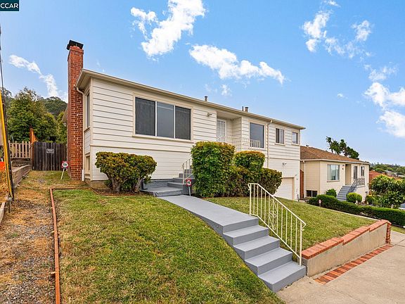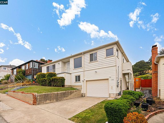 This El Cerrito gem is open and bright with 3 bedrooms 1.5 baths, stunning views bonus room, and a great backyard. Spacious living room features gas fireplace, beautiful hardwood floors, and a huge picture winow that captures mesmerizing SF/Bay views. Enjoy sunsets from the dining room and the remodeled eat in kitchen with stanless steel appliances, custom cabinetry, granite counters and recessed lighting. Private backyard is fully usable with lawn and fruit trees. Additional amenities include: Redwood paneling on the exterior and family room interior walls, newer windows, sewar lateral completed, freshly painted, Lower Level family/bonus room with high ceiings, half bath, fireplace, and new vinyl floors (*this additonal 430 sq ft room - per Home Shots Photography drafting - is not included in the stated square footage of the home. Sq. Footage on record of 1,291 sf includes only upstairs. Buyers to Verify). Attached garage offers workshop space. Walk to Bart, shopping, and lovely parks.