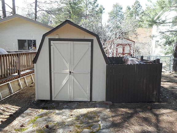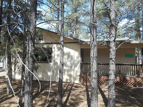 Trees, Trees and More Trees. Buried in Ponderosa Pines, two bedroom, one bath cabin on large corner lot. Great room opens to kitchen. Cabin has newer TREX decks front and back. Covered carport area, large shed, fenced yard. Bedrooms are big. Stackable washer/dryer, Solartubes brighten the entire home. Back deck is extra large, great for outside dining and entertaining. Wood burning stove for those cooler evening. A wonderful escape in Pinewood Country Club in an all cabin area. Sure to go fast!