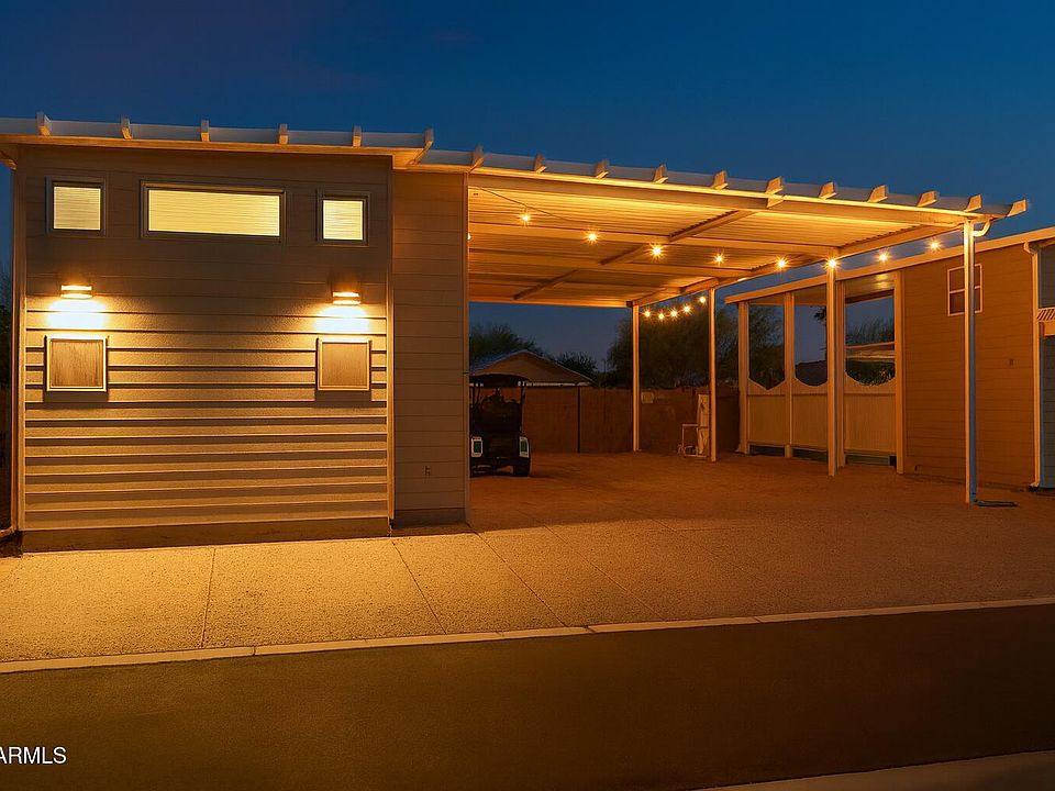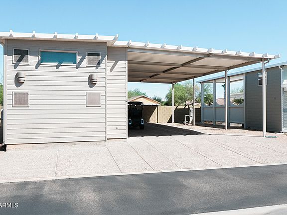 Why spend another winter shoveling snow when you could be playing pickleball in the sunshine? This spectacular AZ stick-built RV port home (not manufactured or mobile) gives you a a home with an attached, covered port to protect your 5th wheel, trailer or coach. The ground-level main suite fits a king size bed and features a step-in shower. The upstairs loft = office, craft, guest room, or storage. Outside, a fully covered RV pad shelters most any size rig. Inside laundry, storage, and updated appliances add convenience PLUS everything stays. In Happy Trails you own your lot (no lot rent) with low HOA fees that cover water, sewer, trash, plus resort amenities, clubs and endless activities. Trade in your snow shovel for a set of clubs, this is winter done right!