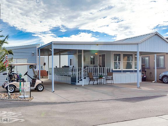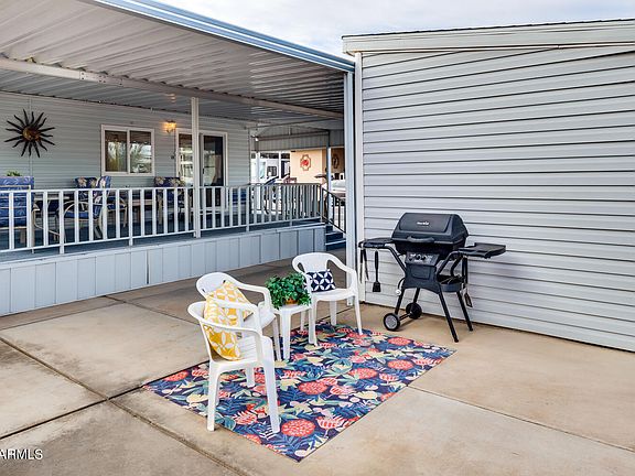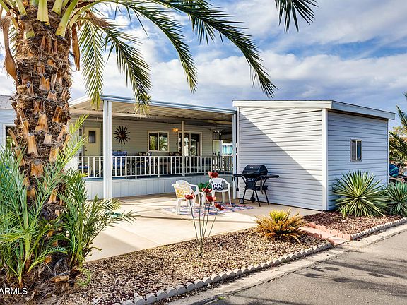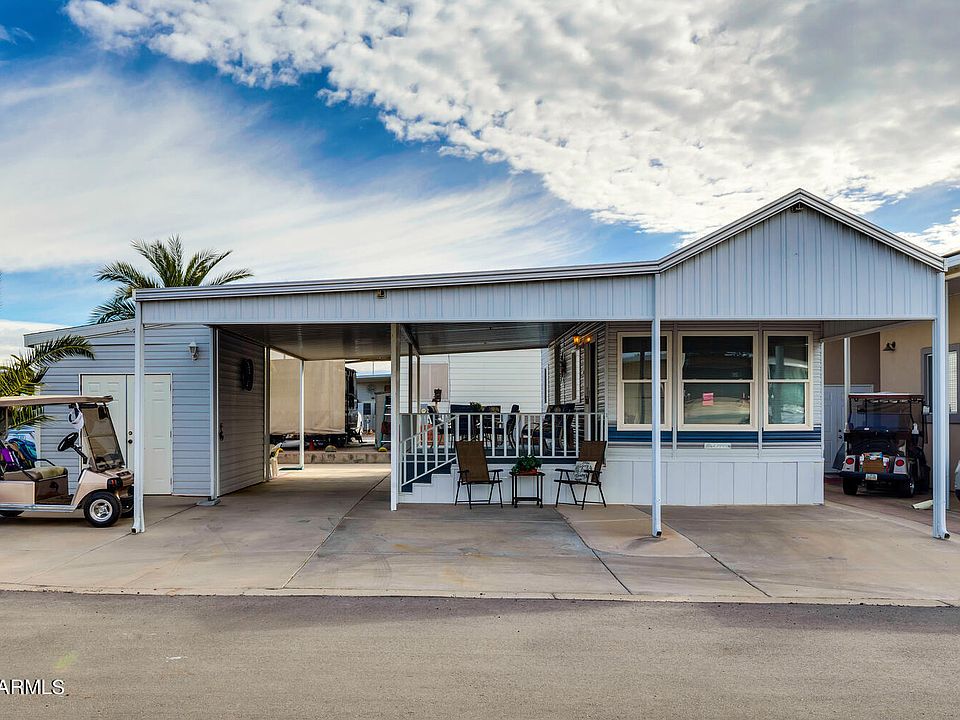 Welcome to beautiful Happy Trails Resort where you can own your own lot! This charming 1996 CAVCO Park Model is light and bright, partially furnished and located on a larger ~3,000 sq. ft. corner lot with plenty of parking space with beautiful west-facing Arizona sunsets every night. This home has a large open porch concept for entertaining friends and family, a BBQ patio area, and a storage shed. New deck carpeting, newer heat pump and windows with PLENTY of room to expand to create your perfect home.