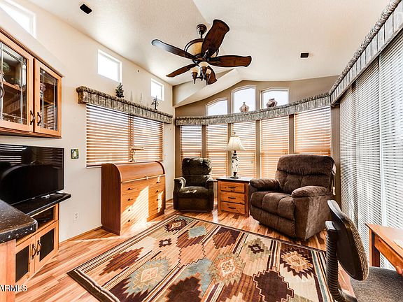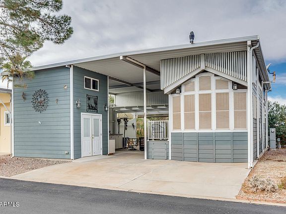 113 is the perfect way to experience Happy Trails to the fullest. A highly factory upgraded Cavco Park Model with Full end to end Awning that covers the huge Outdoor living space and Outdoor Kitchen. Inside the home you'll find upgraded custom cabinets, hard surface counter tops, wood laminate floors, full sized smooth top range, garbage disposal, dishwasher and a host of other great features. Outdoor kitchen has a long tiled counter tops, full size kitchen sink and a built in oven. Custom privacy walls and shades finishes the great space. The 2 story Shed features toilet, sink, stack washer/dryer, refrigerator and an abundance of storage. The outdoor furniture, heaters and all the home furnishings come with this Entertainer's Dream Home. This Happy Trails Gem is priced to sell fast! You own the land in this very lively 55+ Gated Community highlighted by Pickleball & Tennis Courts, Multiple Pools and Spas, Fitness Center, a Host of Craft Clubs, and Restaurant. Lots of Live Entertainment and tons of get-togethers mean there's never a dull moment. Come see what the Happy Trails Lifestyle is all about!