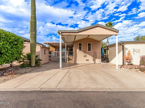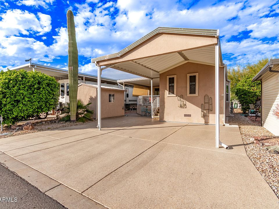 This park model is located in a great Adult community. The home features covered car port and a spacious patio. Living room offers space for a couple chairs or small couch, dining area with a hutch, The kitchen is equipped with a gas stove, microwave, dishwasher and brand new refrigerator. Beautiful vinyl plank flooring in living room dining room and kitchen. Carpet in bedroom and vinyl in bathroom. Sun screens on window that face the west. Lovely side patio and area to make a very nice little oasis in the back yard that backs up to the wash. The shed houses the washer and dryer and still has room to store a golf cart if needed. Happy Trails is a wonderful 55 plus community with a golf course, bar and restaurant, pool, Tennis and pickle ball courts. A new car wash and weekly events.