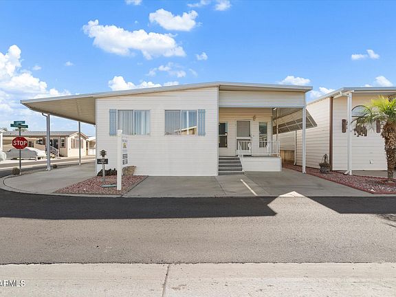 Happy Trails Lot 1265 is new to the market with a 1996 400 sf Cavco Park Model and a custom built 900sf Arizona Room to make this one of the largest homes in Happy Trails. 2 bedroom / 2 bath with spacious living room, bedrooms and coveted climate controlled Sun/Craft Room. Home is situated on a large 3046sf Corner Lot and is covered with a Full Metal Awning over entire space. Work Shop and Shed doubles as Golf Cart garage and there's plenty of shaded parking. This is a well built home with many upgraded features and needs a new owner to bring it back to glory as the carpets look a little tired. A little effort and this home will be your Desert Oasis Paradise. Come check out the possibilities. Happy Trails Resort is a very lively 55+ Gated Community highlighted by Pickleball & Tennis Courts, Multiple Pools and Spas, Fitness Center, a Host of Craft Clubs, and Restaurant. Lots of Live Entertainment and tons of get-togethers mean there's never a dull moment. Come see what the Happy Trails Lifestyle is all about!