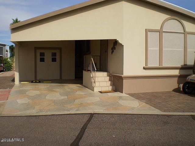Here is beautiful 2 BR 1.75 BA Snugglewide unit on the golf course. It is stuccoed on the outside with flagstone pattern on the drive and full pavers on the front. The front porch has carpeting and back patio has been newly tiled, invincible roof, sunshades, and many more features. In the living room has a entertainment center with a electric fireplace below. In the kitchen is a hard wood flooring as well has granite countertops. There is a inside laundry area with stack washer and dryer located between the guest bath and guest bedroom. In the both bedrooms come with walk-in closets. The master bath is located off the master bedroom. Also there are French doors leading onto the rear deck over looking the golf course.