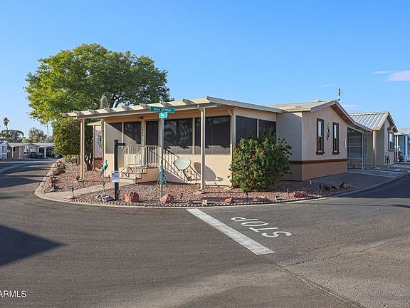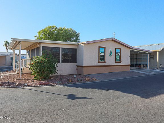 This spacious, light-filled corner lot home with covered parking has been thoughtfully remodeled around 2020 for modern comfort and style. It features a 4.5-ton AC/heat pump with a whole-house air purifier and Wi-Fi thermostat, energy-efficient low-e windows, and a newer 40-gallon water heater. The kitchen is equipped with granite countertops, high-end cabinets, and Stainless appliances. Both bathrooms feature elegant quartz countertops and modern fixtures. Additional upgrades include new electrical wiring, a full stucco exterior, sunroom w/240° views- perfect for entertaining, working, or relaxing. This 2-bedroom, 2-bathroom home is located in Happy Trails Resort, where you own your lot. Turn-key! #shed #2SolarLights #2SkyLights #Sunscreens #WaterFilter/Softener