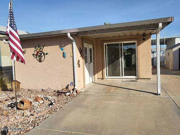 Welcome to this fully remodeled Arizona home on a spacious RV lot, completed in 2021 by Ernie Young. This home offers an expansive living area plus a large versatile bonus room that could serve as a bedroom, a well-appointed kitchen with newer appliances, an indoor washer/dryer, a 3/4 bath with a convenient step-in shower, and ample storage—including a detached storage shed—all conveniently located on one level with no steps to navigate. Key upgrades include a new roof, stucco, electrical, mini-split system, windows, flooring, water heater, and more, ensuring modern comfort and efficiency. The outdoor area is equally impressive, featuring a lovely patio space and rock-based xeriscaping, PLUS, ample room for most RVs. Motivated seller, bring all offers! #HappyTrailsResort #Pickleball