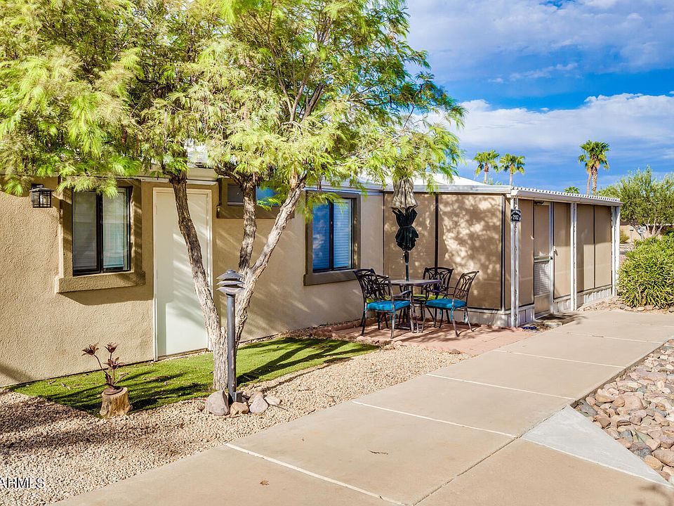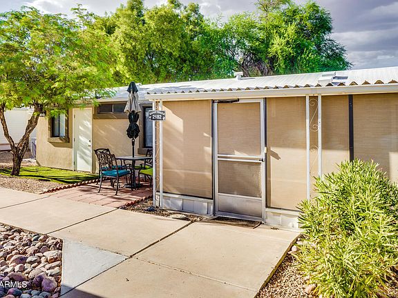 Beautifully Updated ''Turn-Key'' Vacation Villa in Happy Trails. This 2 bedroom, 1 bath, ground level entry home is nestled on a landscaped corner lot and comes with a coveted covered parking spot. Updates include New HVAC (2022), New Floors, Stainless Appliances inc Dish Washer, Bathroom Counter and Fixtures, Sheetrock walls and ceilings, Interior and Exterior doors and the entire Home and Shed has new Exterior Stucco. Front porch is smartly screened in. Full size Stack W/D inside home. **This home is currently Tenant leased Nov 1 thru April 30. Prorated Rental Income to Transfer to new owner.** Affordable HOA includes water, garbage and ground maintenance and access to all the wonderful amenities. Make this your fulltime home, a seasonal get-a-way, or a great investment property You own the land in this very lively 55+ Gated Community highlighted by Pickleball & Tennis Courts, Multiple Pools and Spas, Fitness Center, a Host of Craft Clubs, and Restaurant. Lots of Live Entertainment and tons of get-togethers mean there's never a dull moment. Come see what the Happy Trails Lifestyle is all about!