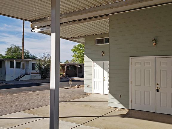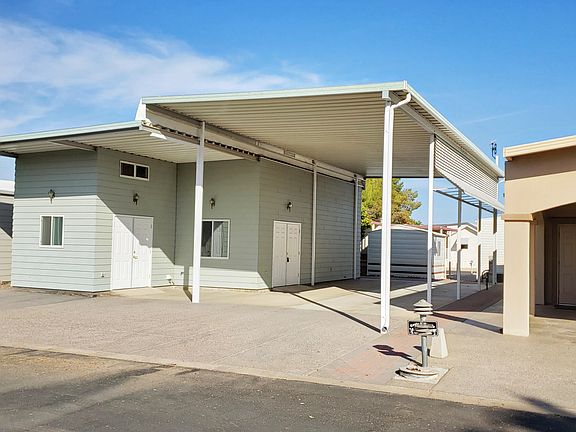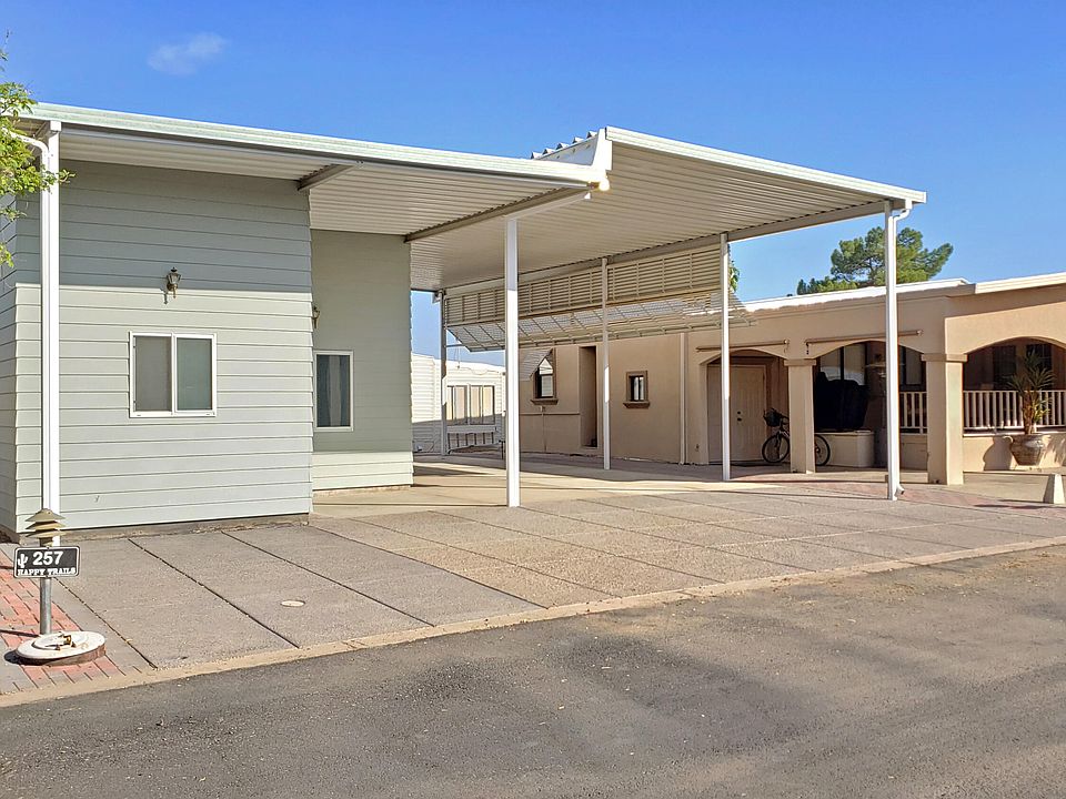 Happy Trails Lot 257 is an Arizona Home with RV Port. This Great RV Site has an extra height Full Awning with a wide berth to allow for plenty of elbow room once all the Glide-Rooms on the RV are out. 2 story shed is plumbed and wired for Washer/Dryer and is perfect for Golf Cart Storage and has pull down stairs to access the storage - Loft area upstairs. The 600+ sqft Arizona Home is wide open to customize to a configuration to fit your need and desires. Currently has a toilet room, water heater, full HVAC. All the walls and ceiling are drywalled, floor is raw cement so it's a blank canvas ready to create your new Desert Get-a-Way Oasis. You own the land in this very lively 55+ Gated Community highlighted by Pickleball & Tennis Courts, Multiple Pools and Spas, Fitness Center, a Host of Craft Clubs, and Restaurant. Lots of Live Entertainment and tons of get-togethers mean there's never a dull moment. Come see what the Happy Trails Lifestyle is all about!