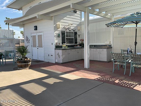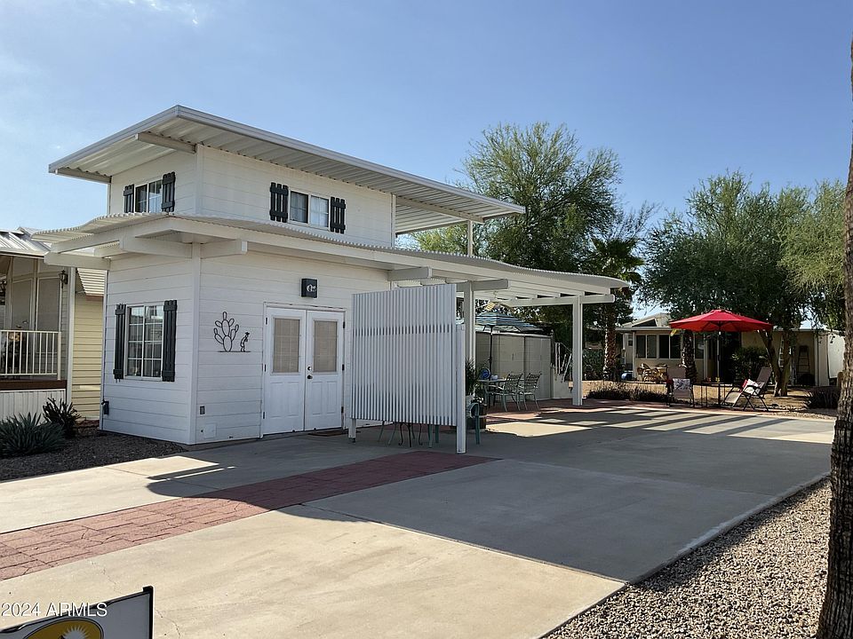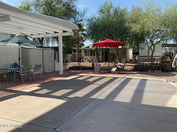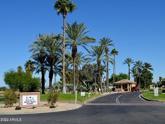 If you are looking to soak up the warm Arizona sun during the fall/winter season, this lot is for you! Leave the cold weather behind and come experience all that Happy Trails has to offer. This north/south exposure RV lot is situated on the rock creek. Entertain under the patio cover, cook in your AZ kitchen and take in the weather all winter long. The shed has a commode, stackable washer and dryer, a portable AC unit, and a carpeted attic space.