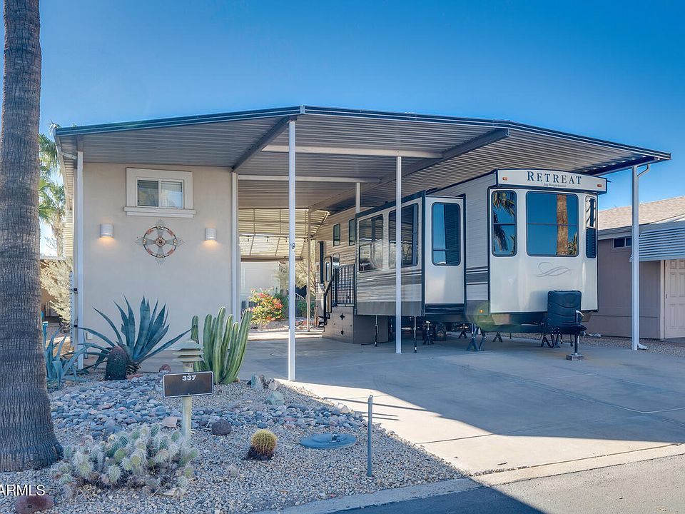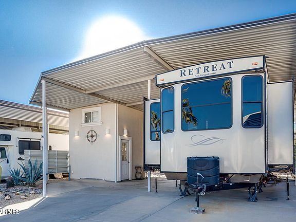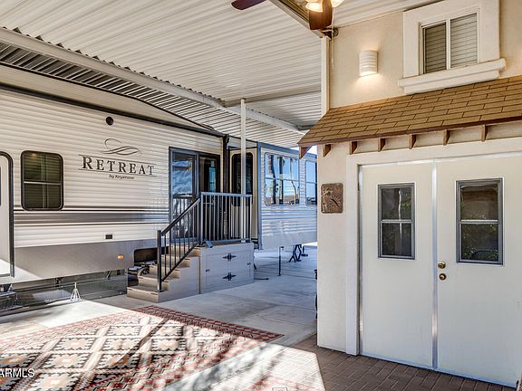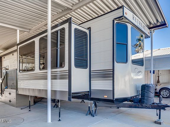 Welcome to Happy Trails Resort where you OWN your lot! Looking for a PRIVATE backyard and Patio area this is it. Lot is FULLY covered and Casita is finished with Washer/Dryer extra Fridge and Sink. Pull down access for additional space above. 2019 Keystone Retreat 39 ft is Included in the sale. One bedroom (King size bed) with Loft, 1 Bath, Theater seating, Fireplace and Large kitchen with Island. All Smart TV's stay. Fully Turn-Key move in ready and ENJOY the HAPPY TRAILS Lifestyle!