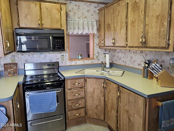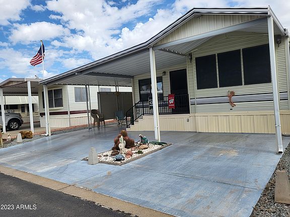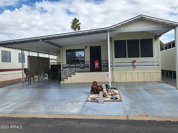Welcome to Happy Trails RV Resort, where you own your lot. Featured here is a sweet little home that is clean and neat as a pin! It is a park model/AZ room with an enclosed deck that could be used as a 2nd bedroom, office or craft room. The AZ room makes a great entertaining/living space which leaves much of the park model for kitchen and dining. Outisde is a shed (washer/dryer) and covered parking. Happy Trails offers tons of amenities, activities and clubs to keep you entertained and active. There is pickleball, tennis, fitness center, library, pools, hot tubs, woodworking, sewing, crafting, ceramics, glass studio and much more! Happy Trails is a 55+, gated community that offers a unique year-round living experience.