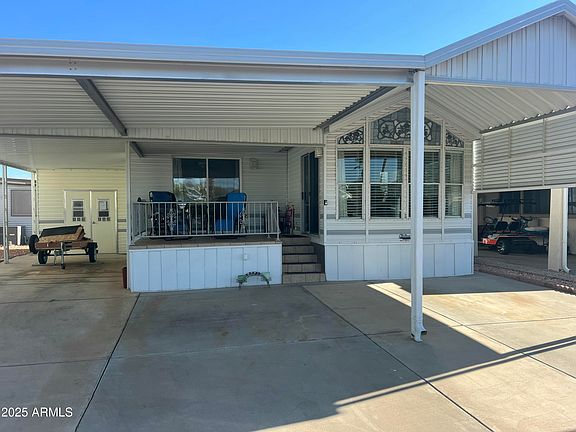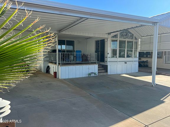 Check out this charming Park Model home with an Arizona room that comes fully furnished and is situated on a nice lot. This sweet home features 1 bedroom, 1.5 baths plus a large family room! There is an in-unit washer/dryer, a sealed roof and a skylight in the kitchen, creating a very light and bright atmosphere. From the large front porch you have a view of our AZ sunsets. This home also offers a large storage shed. The home is clean, furnished, well-maintained and move-in ready. This home comes with a One-Year Home Warranty too! #HappyTrailsResort #MoveInReady