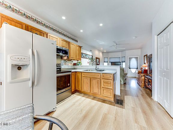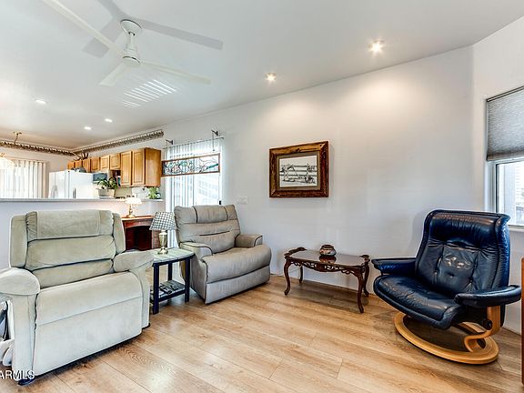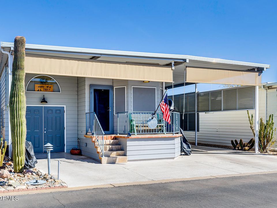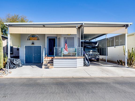Come check out this beautiful stick-built home with an RV port Located inside Happy Trails Resort where you OWN YOUR OWN LAND! This meticulously maintained, upgraded home has a fully covered RV port to accommodate most size rigs & measures ~13'6''. Enjoy mornings on your east-facing back deck overlooking the rock creek/greenbelt. Afternoons are shaded on the back deck with the front deck receiving full sun in the winter. Back deck is fenced for privacy or pet. This home has recently been upgraded with low allergen/nontoxic flooring, & a UV AirScrubber AC/Heat Pump. The bedroom is light & bright w/ a spacious ensuite bath w/walk-in shower & desk area. Washer/dryer is located inside the home. Surrounding awnings have ample sunshades, & both decks have travertine tile. More.... The golf cart shed/workshop/craft room is well insulated with an AC unit to keep it cool in warmer weather. Come experience Happy Trails Resort in Surprise, AZ with an abundance of amenities, numerous activities, and low HOA dues unlike any other in the state!