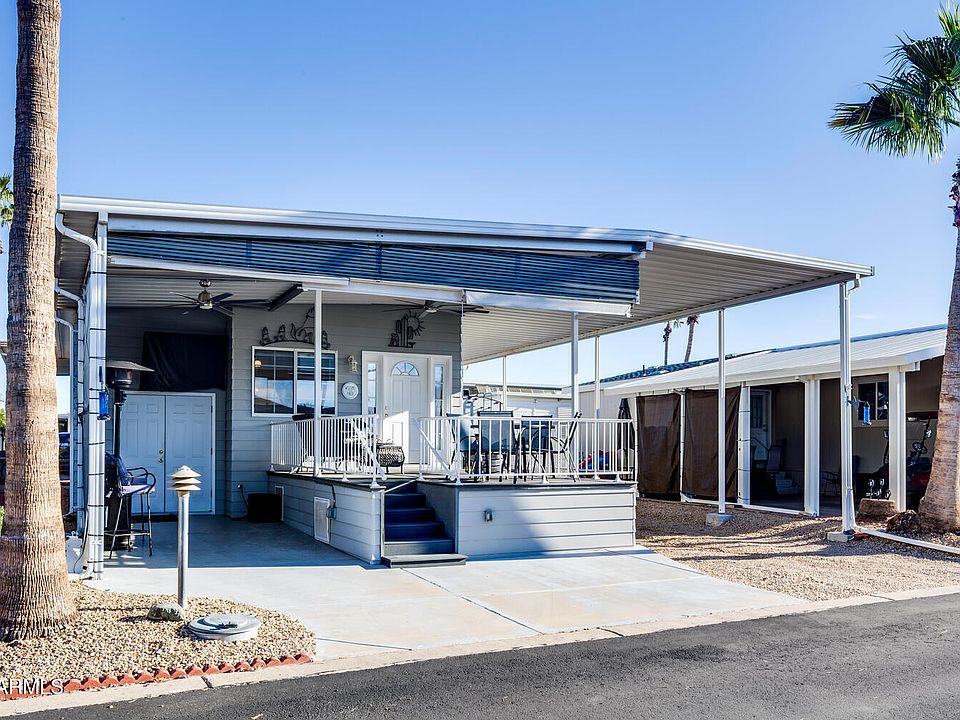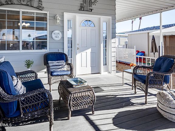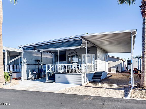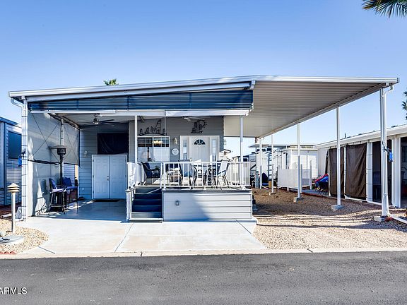 This ''Covered'' lot has the ''Best of Both Worlds'' a place to park your RV (on your own lot) along with a wonderful ''Stick Built'' one bedroom, one bath home. Comes Fully Furnished, New SS Appliances, New Furniture, New Washer/Dryer. Large Entertainment size ''Trex'' deck with a Mountain View! Casita for storage & extra fridge. Happy Trails is a Active 55+ community where ''You OWN your Lot'' with lots of amenities for everyone. Pride of Ownership shows!