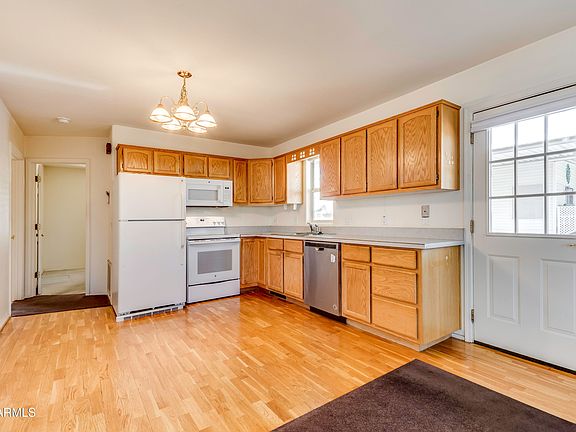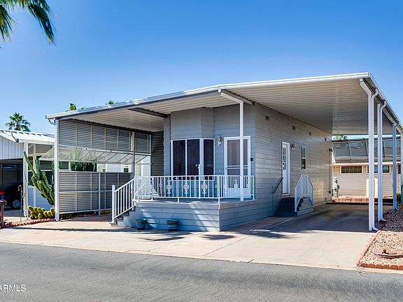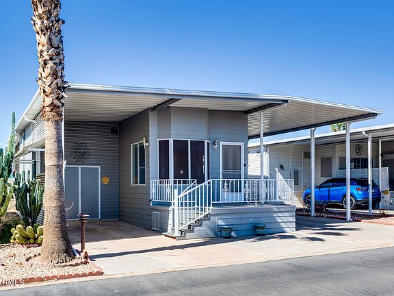 Move in to this 785 sq ft AZ home perfectly situated near Cascade center and Pickleball Courts! This stick-built retreat offers both comfort and convenience, making it an awesome home for year-round or seasonal living. The front porch welcomes you in to this lovely 2 bedroom, one bath home that you can make your own. The main bedroom has walk in closet. Bathroom has walk-in shower with safety features and includes a washer and dryer. The shed has plenty of storage cabinets and golf cart parking. The home is complete with a covered RV pad that can accommodate most size RVs. The HVAC is only 2 years old. This home has what you need to enjoy Happy Trails Resort and AZ desert living