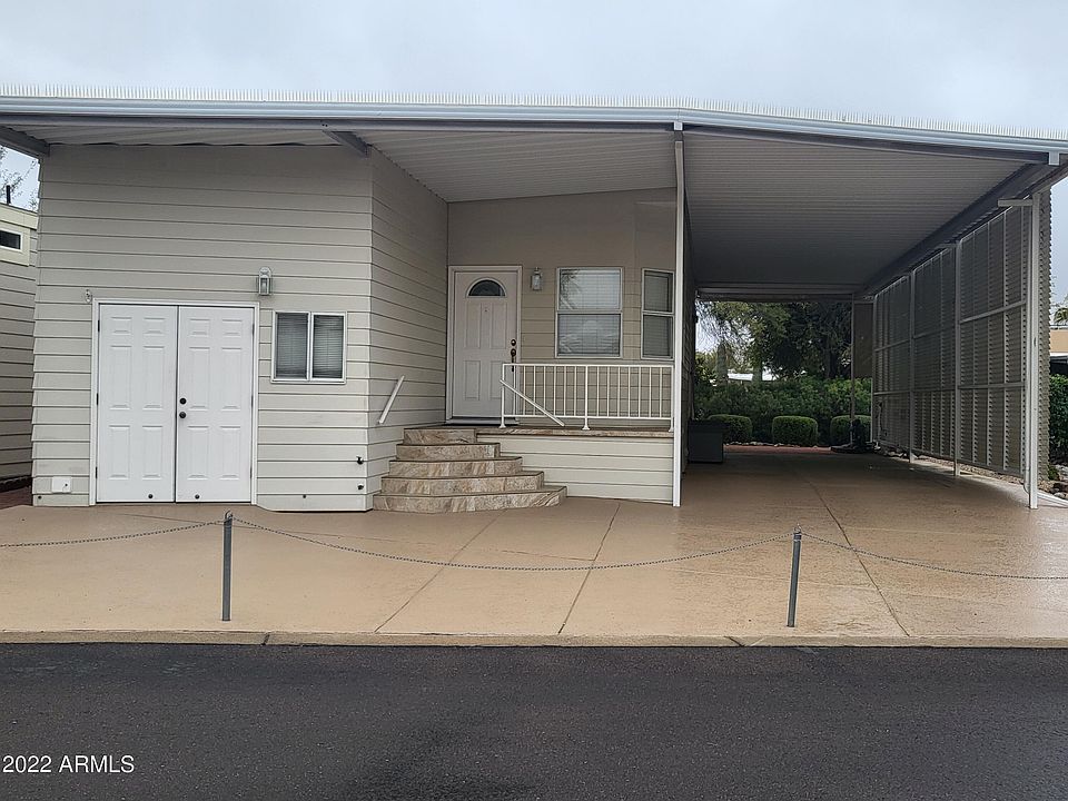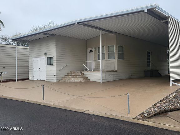 Welcome to Happy Trails, the RV Resort where you own your lot! Debuting here is a lovely stick-built home with an RV port on the golf course! This 1 bd/1ba home comes complete with all the basics to start your retirement in style. It is light and bright with walls of windows and a light color palette. Besides backing to the golf course, one side of the property adjoins green belt space. This home has a good amount of parking & a storage shed for keeping your extras. Happy Trails is an age restricted 55+ resort with entertainment and activities galore. 4 pools & 7 hottubs will keep you relaxed after a hard game of pickleball or a workout in the fitness ctr. Go see a show or have a meal at our restaurant. Hang out at the dog park or learn to make jewelry- you'll never be bored here