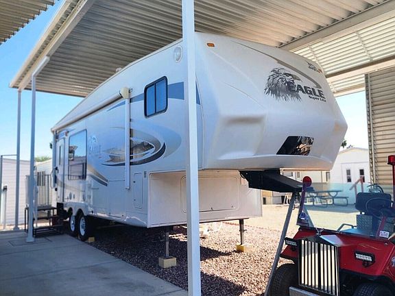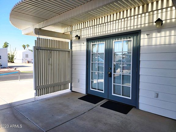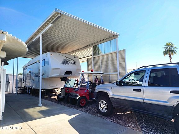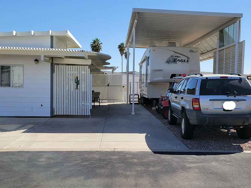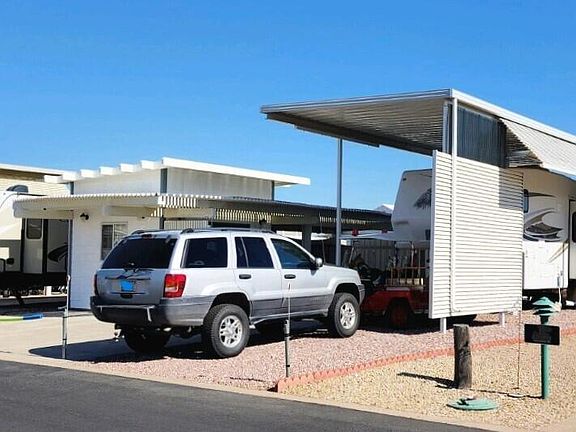 Covered RV Lot FOR SALE in active, 55+, RV community of Happy Trails featuring a privacy patio & utility Building w/plumbing. This lot features a 14ft tall x 13'6'' side x 37'6'' long awning w/partial side panels to provide shade & privacy. The air conditioned/heated utility building comes with new paint, new floor (see pics), ceiling fan, half bath, stackable washer & dryer, mini fridge with plenty of room for indoor shower, work shop or a retreat of your choosing. Outside is a covered privacy patio equipped w/ceiling fan & plumbing for an outdoor sink. Exterior paint completed Summer of 2023.