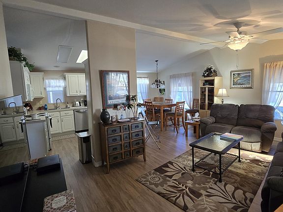 Across the street from Golf Course Hole #12 and Town Center. Enjoy resort-style living in this gated 55 community where the land is deeded to the Buyer. Plenty of room with 2 Bedrooms, 2 Bathrooms Double-Wide Mobile Home, Golf Cart garage and Golf Cart included. Upgraded Heat Pump (2024, W/D (2024), Cabinet Paint, Garbage Disposal & Sink (2024), Flooring (2020), Awning (2015). Fully Furnished Great opportunity for the savvy buyer.