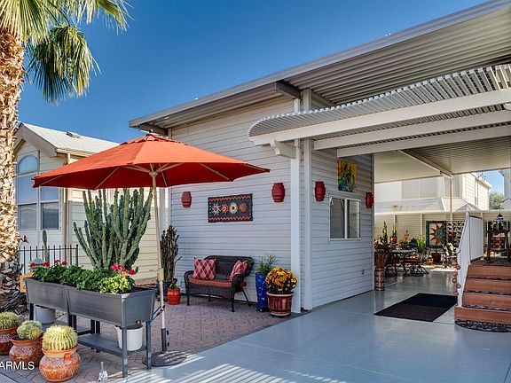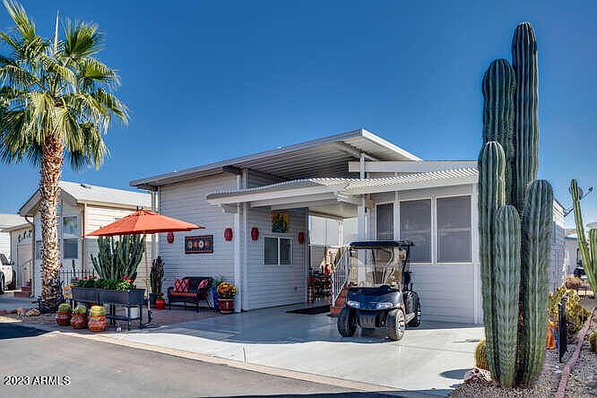 Rare Happy Trails gem! This 2007 CAVCO park model is the epitome of beautiful, outdoor Arizona living and entertainment at its finest! This immaculate park model with an expansive outdoor living area has been meticulously decorated in Southwest décor. ALL the indoor AND outdoor furnishings, artwork, and even the EZ-Go golf cart is included in this one-of-a-kind, turnkey property. This home has a full awning with just enough morning sun on your back patio to enjoy the warm sun in the winter months. Patio heaters will warm up your outdoor gathering place with plenty of seating, large BBQ and a mature cactus garden. The front gathering place is perfectly shaded and decorated to enjoy time with friends. This one won't last. Start enjoying the outdoor living at beautiful Happy Trails Resort AC unit is 3 years new, 2013 EZ Go golf cart has newer batteries (less than 2yrs old) and 48v charger, track lighting and sky lights throughout, GE stove, microwave, mini dishwasher, and Whirlpool refrigerator. Stained glass features in windows convey as well as all the fine art pieces in this home. The shed has a built-in desk/workspace refrigerator and commode and plenty of storage upstairs.