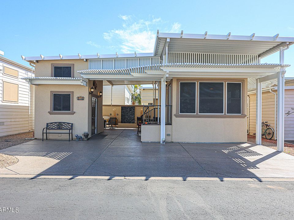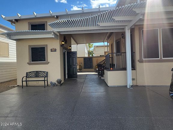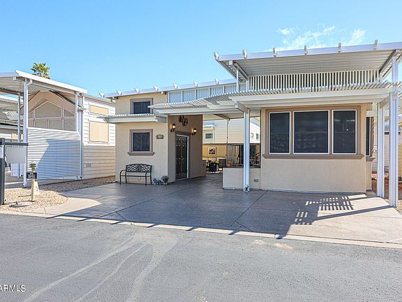 Welcome to No. 818, a Park Model home with a detached casita that blends charm and practicality. Turn-key and well-organized with ample cabinets and closets, it features a spacious patio under a large awning, complete with an outdoor counter, sink, and dedicated water heater. Maintenance-free decking enhances the front and back stairs. The casita includes a washer/dryer and 3/4 bath. Outdoor highlights include a covered area with stucco finish, patio walls, grill, Bosch dishwasher, KitchenAid BBQ, granite countertops, and a decorative water feature. Newer appliances, including a double oven, ensure modern convenience in this appealing move-in ready property. #OwnYourLot #HappyTrailsResort #Retirement #Pickleball #Golf #Active #Arizona Make an Offer!