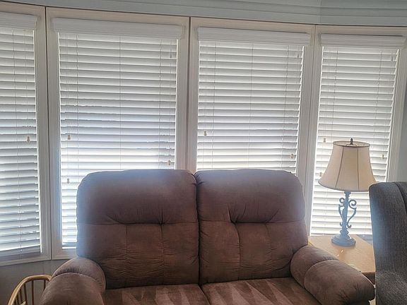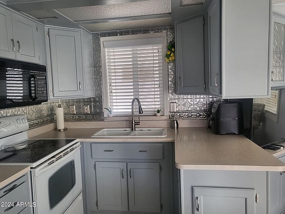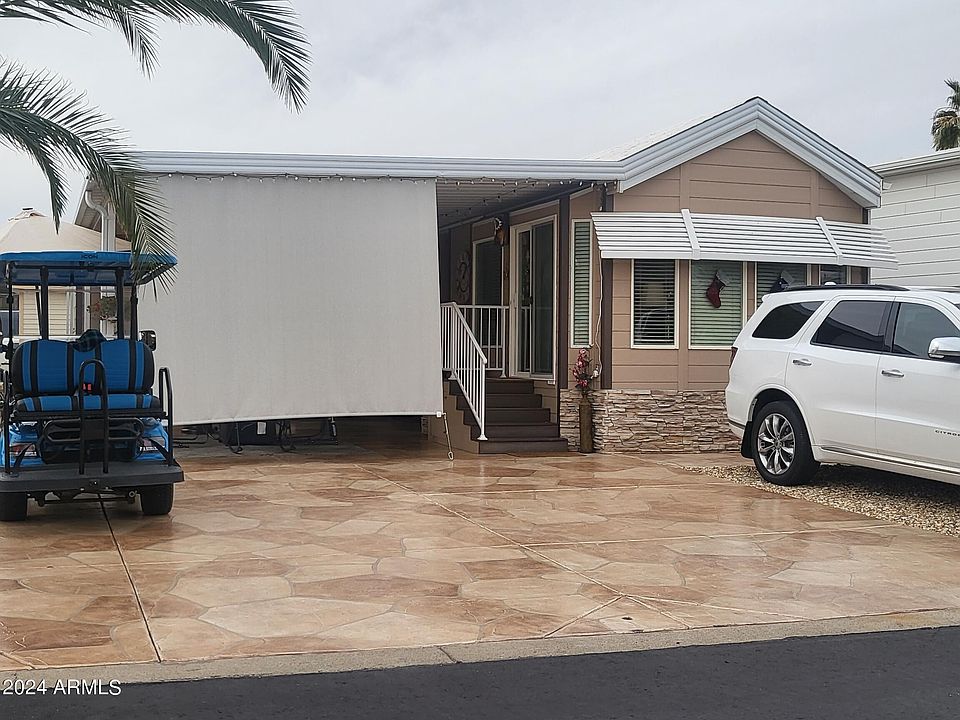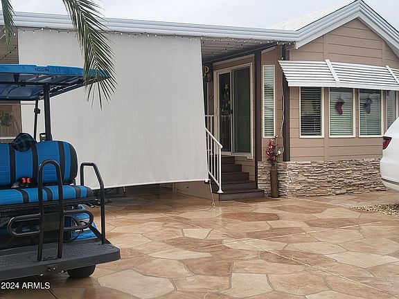 This well-lit and immaculately maintained park model home features elegant tile flooring throughout. The kitchen is equipped with a modern cooktop stove, while the bedroom boasts a spacious vanity. The interior design is contemporary, showcasing soothing light blue tones and decorative stamped metal inlays adorning the cabinetry. Additionally, the property includes a fully finished shed equipped with a convenient extra toilet, sink, shower, a stackable washer and dryer, as well as ample storage space. This turn-key property is ready for immediate enjoyment (includes most everything minus owner's personal items). Outside, a large, covered private entertainment area is enhanced with pull-down shades, perfect for hosting or relaxing in a secluded setting. #OwnYourLot #TonsOfAmenities