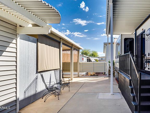 Happy Trails RV Lot #853 has a great Shed with Washer and Dryer, Sink Basin and lots of storage. Awning extends off shed to provide a private, shaded space perfect for enjoying the Arizona outdoor living. Full length Awning shades the Beautiful 2020 Cedar Creek Cottage. This Park Model Trailer with Slides on both sides provides a luxurious home away from home. Rear Living Room with large TV, Electric Fireplace, Couch and Recliner Sofa. The huge center kitchen has hard surface counter tops with center Island galley sink and extra storage throughout. The Bath boasts a large walk in shower and plenty of elbow room. Front Bedroom provides loads of storage a King Bed, large wardrobe and wall mounted TV. Nice Golf Cart available on Separate bill of sale. Come join the very active, 55+, Gated Community of Happy Trails where you own the land and the affordable HOA includes unlimited water, sewer, garbage service twice a week and full access to the wonderful amenities. Pickleball, Tennis, Multiple Pools and Spas, Fitness Centers, Billiard Room, Horseshoes and Shuffleboard. Fun Filled Activities / Entertainment Calendar, Chef Peter's BBQ Chuckwagon Restaurant, Happy Hour Socials and tons of Craft Clubs makes Happy Trails a One of Kind Desert Oasis.