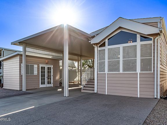 This stunning and very comfortable 1-bedroom park model offers everything you need for a relaxed and carefree lifestyle! Featuring vaulted ceilings with skylight windows, a full kitchen, an additional 120-square-foot storage and laundry room, and a large pergola area perfect for outdoor dining, this home truly has it all. Located in the sought-after Happy Trails Resort in sunny Surprise, AZ, you'll enjoy incredible amenities like multiple pool areas, pickleball and tennis courts, a workout center, a clubhouse, and even an 18-hole golf course. Plus, at Happy Trails, you also own your land!