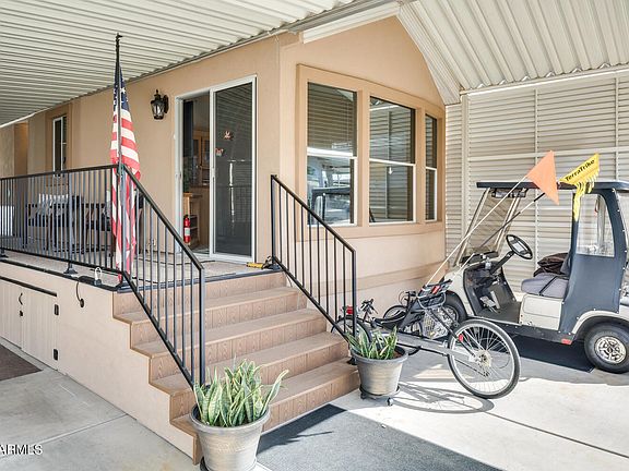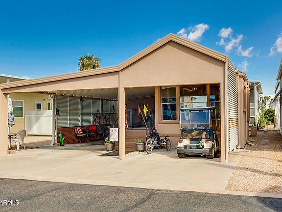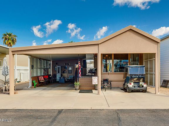 Sweet Happy Trails 1B-1B CAVCO Park Model is super sharp. Many updates make this, well appointed, FURNISHED home a live-in ready Oasis. The double entry porch has tons of storage underneath and is in addition to the huge Shed that is very smartly finished & set up as a Work Shop Craft Room, complete w/ Fridge, Microwave, W/D and TV. The Kitchen boasts Newer Stainless Appliances, Tile Countertops and lots of cupboards. The home was recently Stucco'd for extra insulation and neat, maintenance free appearance. Expansive covered outdoor living space includes patio furniture and fire table to gather around with friends and provides shaded parking. Live the Happy Trails lifestyle where there's loads of activities, craft clubs and well maintained sports courts, pools & spas. Nice Golf Cart is available for Sale on Separate Bill of Sale. Happy Trails is unique in that you own the land. The super friendly, gated 55+ Community has an affordable HOA that includes unlimited water, sewer and garbage service twice a week as well as full access to all the wonderful amenities.