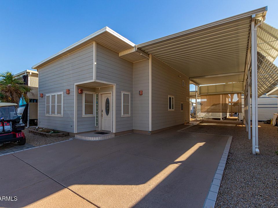 Perfect getaway for the winter months or full-time cozy home in amenity-enriched Happy Trails Resort. Stick built 1 bedroom, 1.5 bath home with covered 40'' RV parking. Bright open floorplan with great natural light. Kitchen features stainless steel & black appliances, island with seating area, and pantry. Large bedroom. Enjoy morning coffee on the back patio. Open double doors to shed with kitchenette, desk area, laundry and toilet. Community amenities include pickle ball, tennis courts, bocce ball, fitness center, multiple pools, RV & car wash, oil change facility and social clubs.